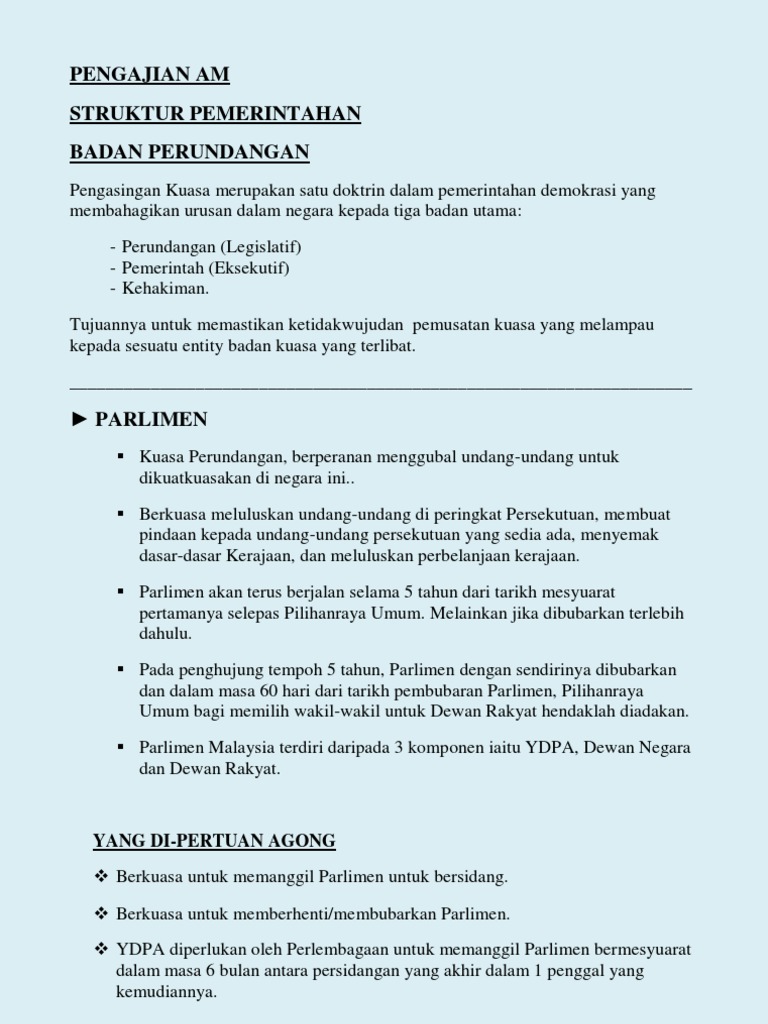 521 FUNGSI DAN KOMPONEN PARLIMEN. V YDPA memperkenankan rang undang-undangpindaan undang-undangpindaan Perlembagaan yang telah diluluskan oleh Parlimen dalam masa 30 hari supaya undang-undang tersebut dapat berkuat kuasa apabila diwartakan menjadi warta kerajaan. Nota Ringkas Pengajian Am Penggal 1 siri 1 KONSEP NEGARA Konsep Negara ada sempadan ada sistem pemerintahan ada rakyatpemastautin tetap Sempadan negara yang beradaulat ada sempadan yang jelas sempadan membolehkan negara yang beradaulat ditadbir dengan sistematik sempadan menentukan bidangkuasa politikekonomi dan mobiliti sosial negara yang berdaulat Sistem.